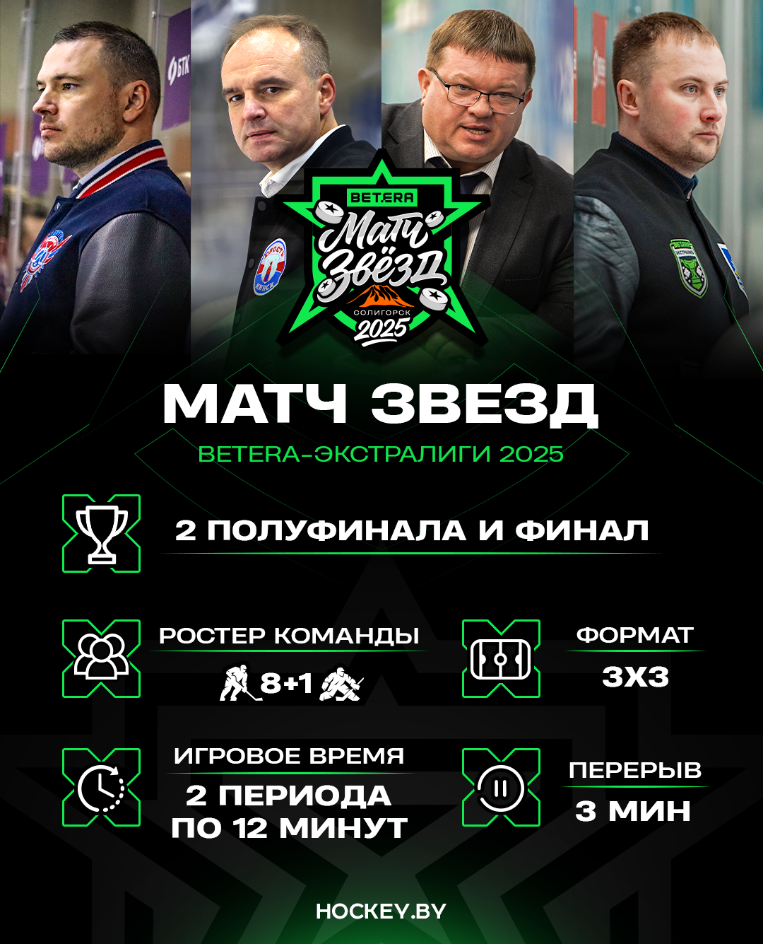 27 декабря в Солигорске состоится Матч звезд Betera-Экстралиги 2025. Традицию проведения таких шоу-поединков решено возродить спустя почти 18 лет. Предыдущий Матч звезд прошел 22 января 2008 года в Новополоцке. Всего же в истории чемпионатов Беларуси были проведены четыре такие игры.