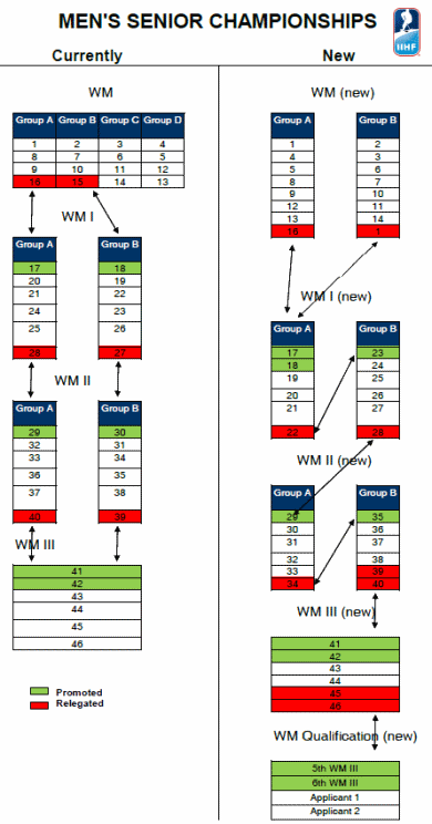 Сегодня, 12 мая, на ежегодном конгрессе ИИХФ в Братиславе была утверждена новая структура проведения чемпионатов мира в дивизионах I, II, III, начиная с сезона 2011-2012. Новая структура была одобрена членами всех национальных ассоциаций. Изменения в структуре проведения чемпионатов мира были инициированы с целью дать возможность командам играть именно на том уровне, на котором находится развитие хоккея в их стране. ИИХФ провела анализ результатов чемпионатов мира в сезоне 2010-2011 (национальные сборные, сборные до 20 лет и до 18 лет) и было выяснено, что от 49 до 68 % матчей закончились победой одной из команд с разницей в 5 шайб и больше. Отныне группы в дивизионах будут располагаться вертикально, а не горизонтально. Это значит, что, например, в Дивизионе I в группе А будут играть лучшие шесть команд, а остальные шесть, чей рейтинг ниже, составят группу В. Таким образом, две лучшие сборные группы А на следующий год войдут в топ-дивизион. Команда, занявшая последнее место в группе А, опускается в группу В, а лучшая команда группы В переходит в группу А. Соответственно, чемпион дивизиона II в группе А переходит в дивизион I группу В.