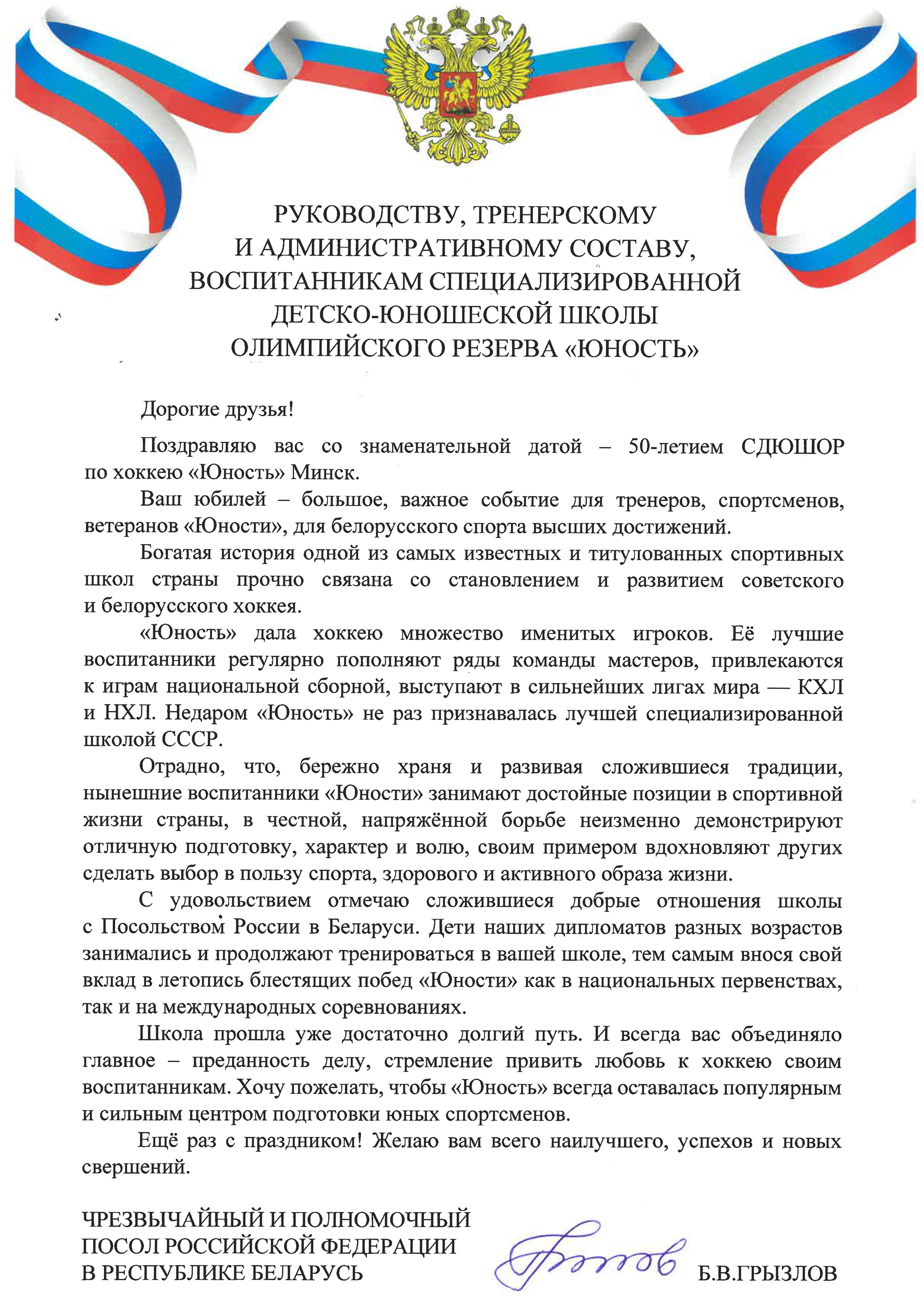 С удовольствием отмечаю сложившиеся добрые отношения школы с Посольством России в Беларуси. Дети наших дипломатов разных возрастов занимались и продолжают тренироваться в вашей школе, тем самым внося свой вклад в летопись блестящих побед «Юности» как в национальных первенствах, так и на международных соревнованиях.