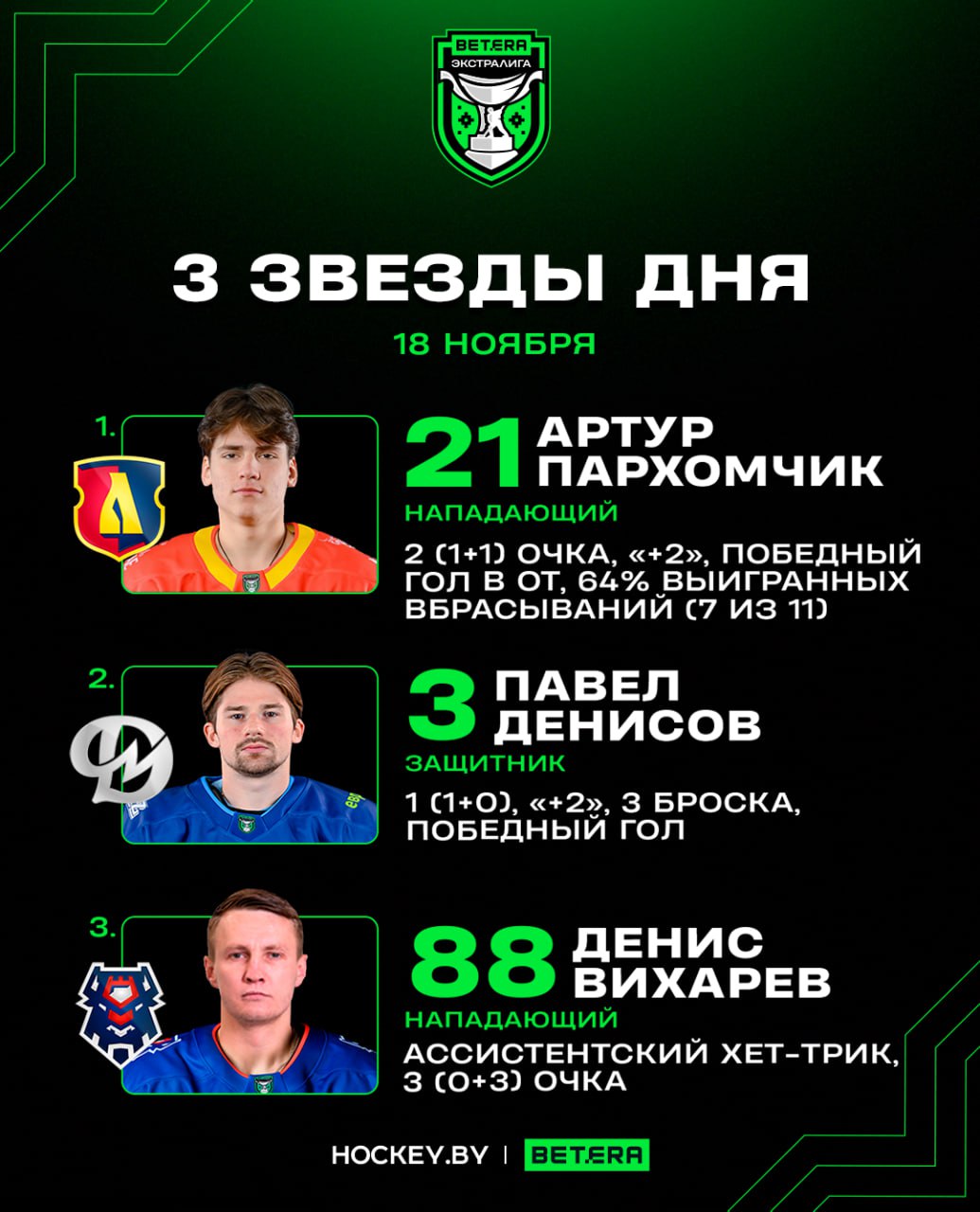 Артур Пархомчик, Павел Денисов, Денис Вихарев – три звезды вторника в Betera-Экстралиге