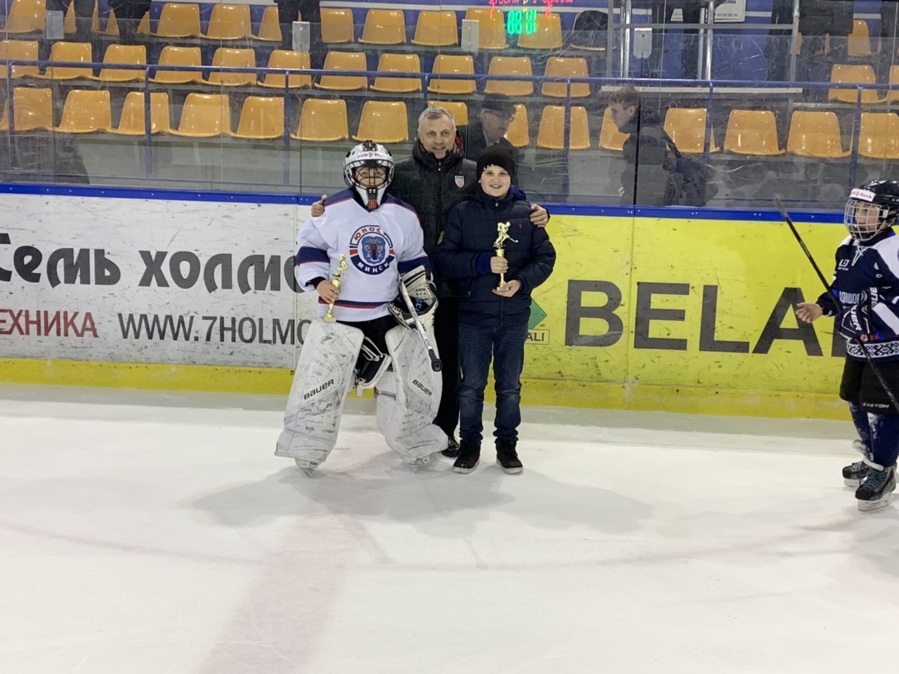 Виктория юношей из БФСО позволила хозяевам льда возглавить таблицу розыгрыша столичного чемпионата. В составе «бело-синих» были замечены известные белорусскому болельщику фамилии: Калюжный, Дудик, Мелешко, Новицкий, Стась, Кулаков. Последний, к слову, стал автором последней шайбы матча.