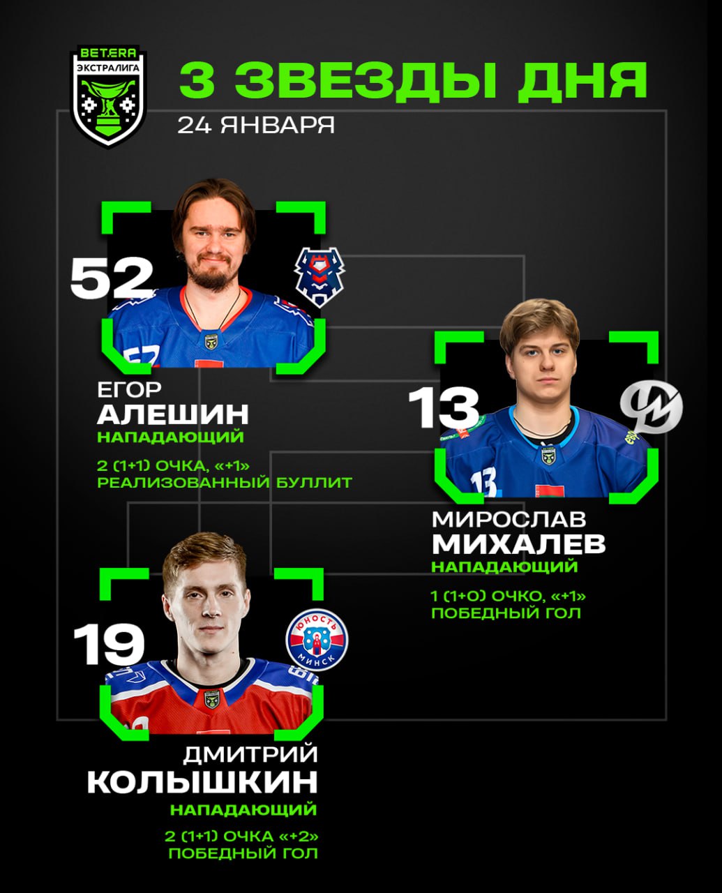 Егор Алешин, Мирослав Михалев и Дмитрий Колышкин – три звезды пятницы в Betera-Экстралиге