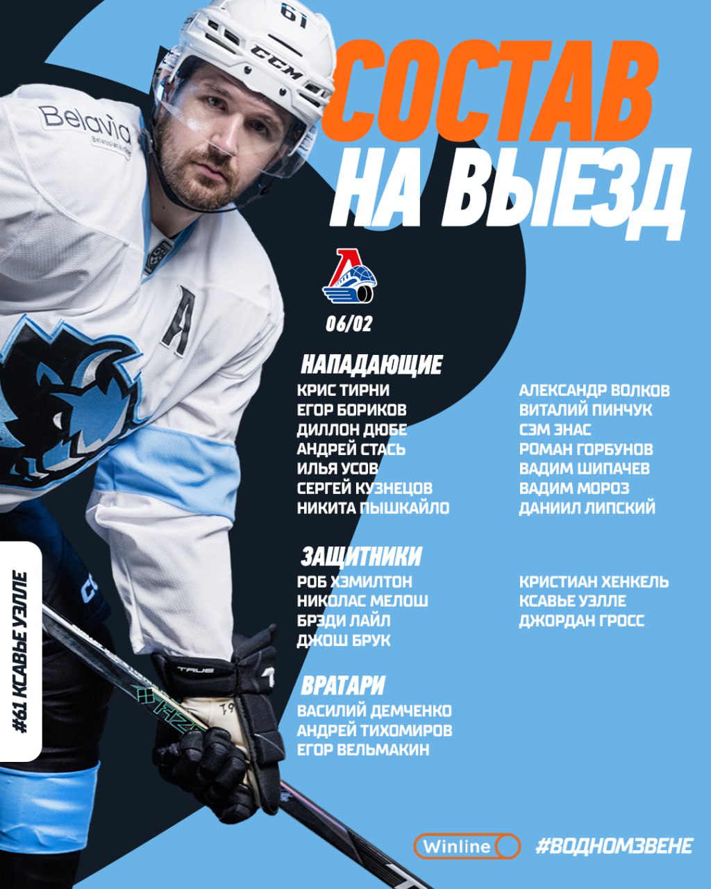 Нападающие: Крис Тирни, Егор Бориков, Диллон Дюбе, Андрей Стась, Илья Усов, Сергей Кузнецов, Никита Пышкайло, Александр Волков, Виталий Пинчук, Сэм Энас, Роман Горбунов, Вадим Шипачев, Вадим Мороз, Даниил Липский.