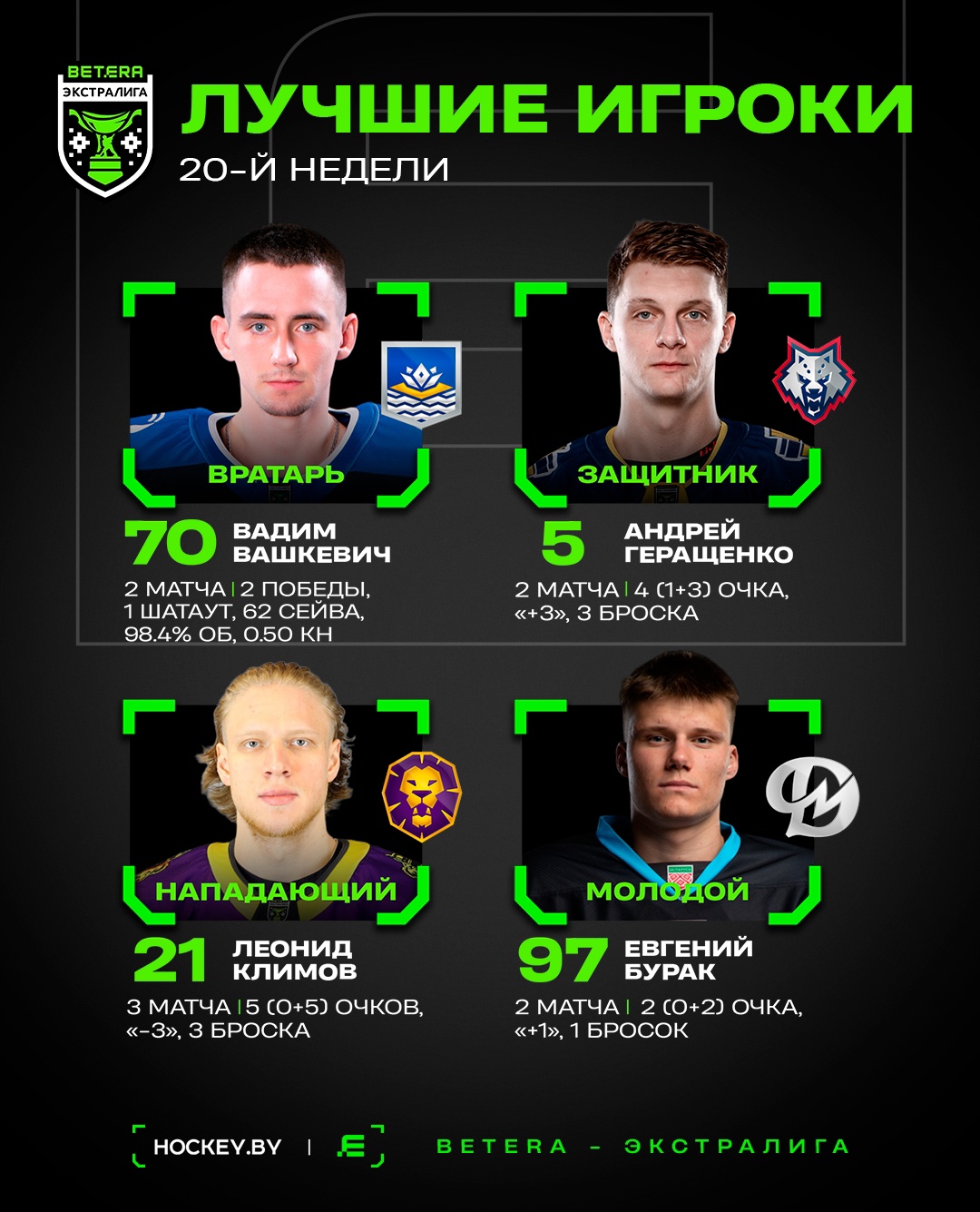 Вашкевич, Геращенко, Климов и Бурак – лучшие игроки 20-й недели Betera-Экстралиги