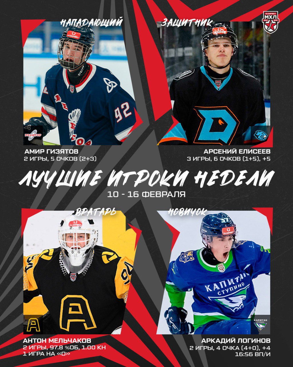 Защитник «Динамо-Шинника» Арсений Елисеев назван лучшим игроком обороны 23-й недели регулярного чемпионата МХЛ.