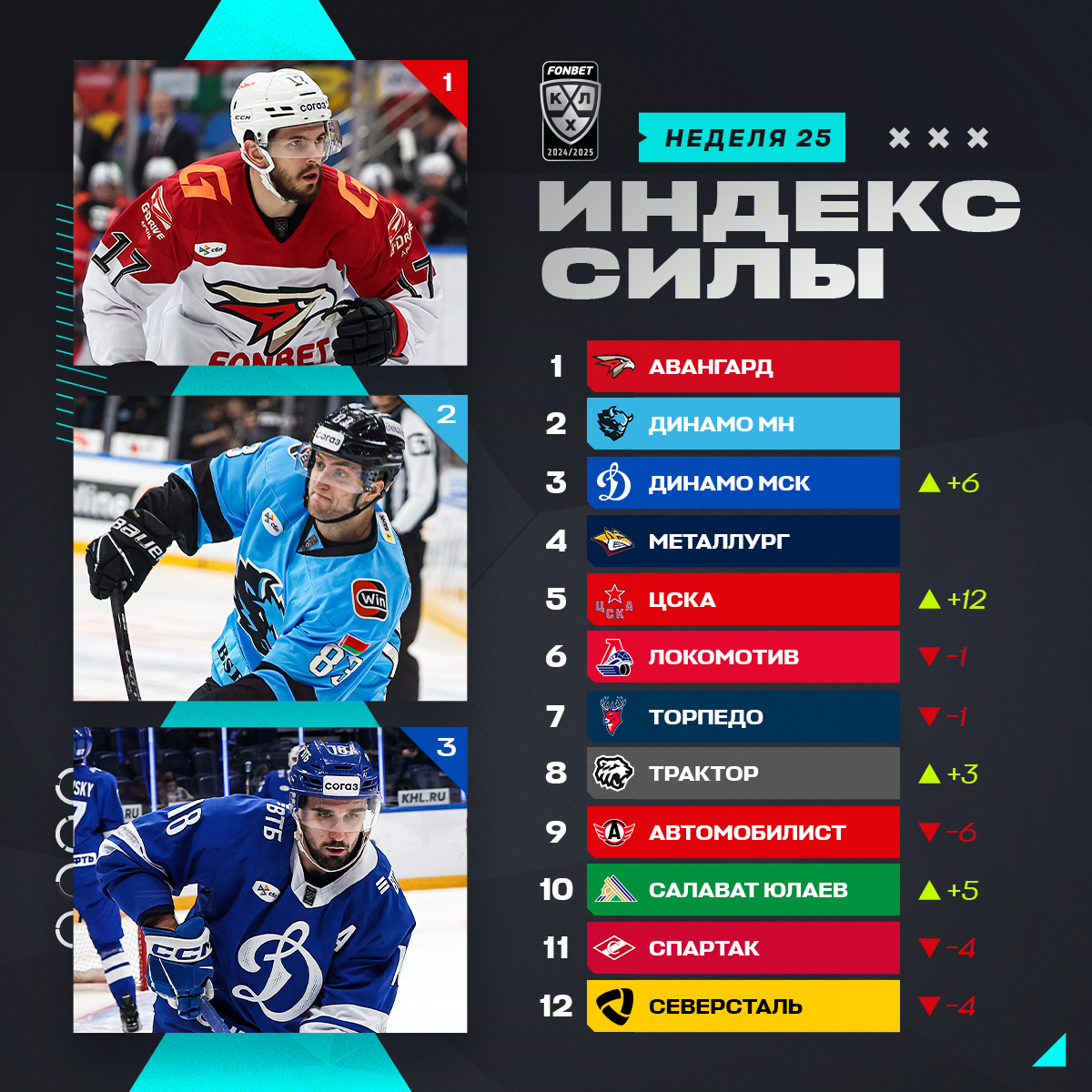 Минское «Динамо» занимает 2-е место в индексе силы по итогам 25-й недели сезона КХЛ 2024/25