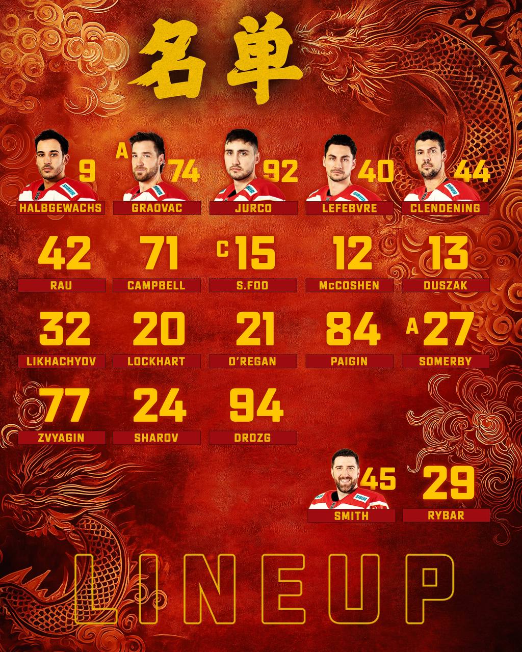 КУНЬЛУНЬ РЕД СТАР: Смит (Рыбар); Лефевр – Кленденинг, Хэлбгевакс – Граовац (А) – Юрчо; МакКошен – Душак, Рау – Кэмпбелл – С. Фу (К); Пайгин – Сомерби (А), Лихачев – Локхарт – О’Риган; Звягин – Шаров – Дрозг.