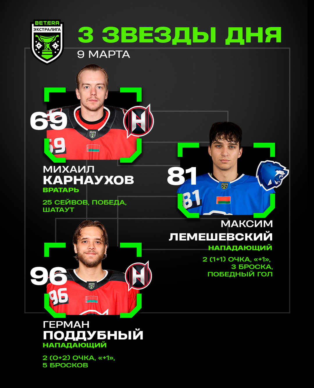 Михаил Карнаухов, Максим Лемешевский и Герман Поддубный – три звезды воскресенья в плей-офф Betera-Экстралиги