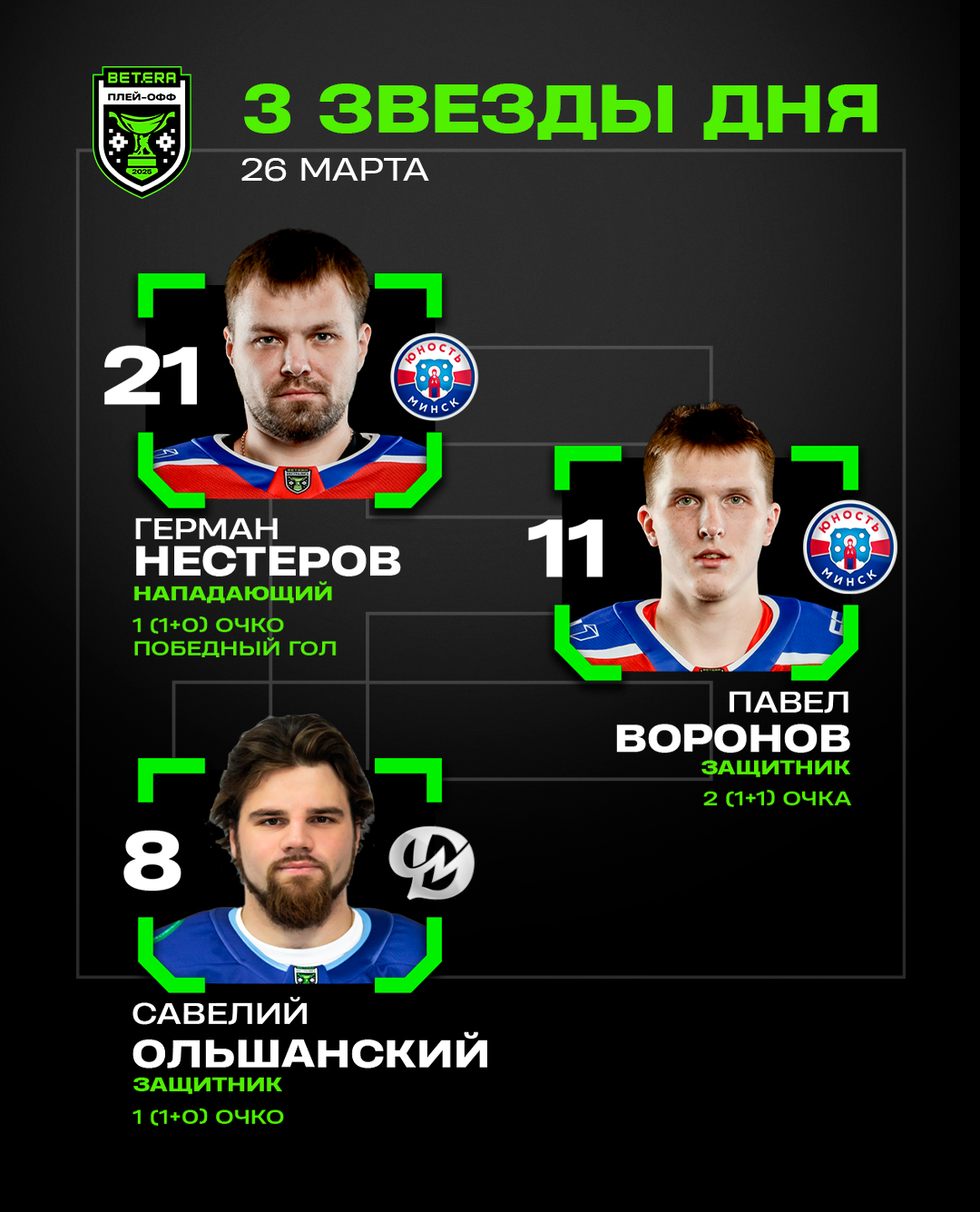 26 марта минская «Юность» взяла верх над «Динамо-Молодечно» (3:1) во втором поединке полуфинальной серии Кубка Президента и удвоила перевес в противостоянии (2-0). Редакция Hockey.by называет трех звезд встречи.