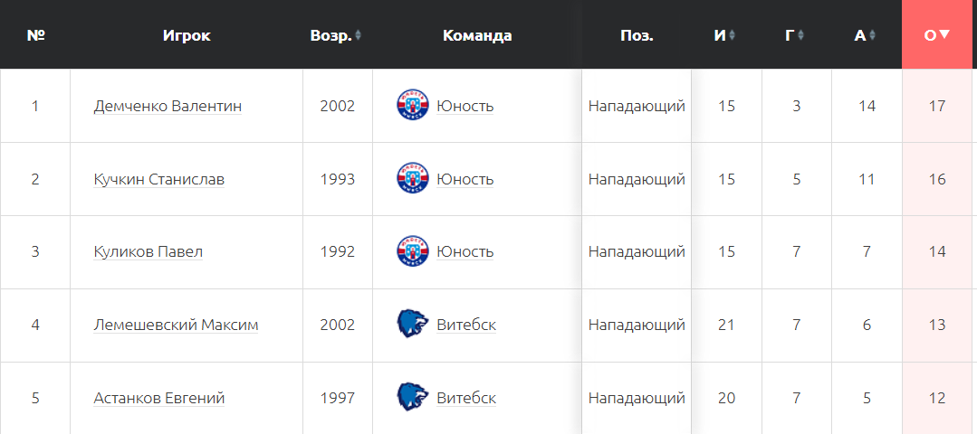 Вторая строка у форварда «Юности» Станислава Кучкина – 16 (5+11) очков в 15 матчах. Нападающий минчан Павел Куликов на третьем месте – 14 (7+7) баллов в 15 поединках. В топ-5 также вошли два игрока «Витебска»: Максим Лемешевский – 13 (7+6) и Евгений Астанков – 12 (7+5).