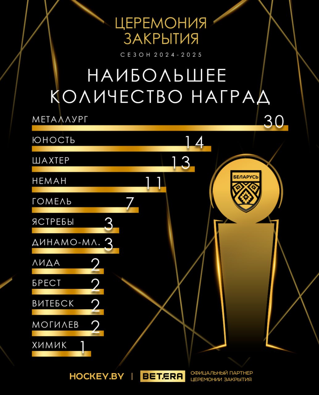 Лидерство по наградам за четыре года проведения мероприятия является «Металлург» – у жлобинчан их 30! Неплохие шансы приблизиться к «волкам» в этом сезоне имеет «Юность». Минчане с 14 статуэтками располагаются на втором месте, а совсем недавно завоевали 11-й чемпионский титул. Среди номинантов на награды немало представителей столичного клуба. Лидер среди хоккеистов – экс-капитан «Юности», а ныне тренер Андрей Антонов, у него семь наград.