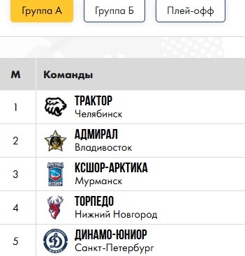 В группу «А» вошли челябинский «Трактор», «Адмирал» (Владивосток), «КСШОР-Арктика» (Мурманск), «Торпедо» (Нижний Новгород) и «Динамо-Юниор» (Санкт-Петербург).