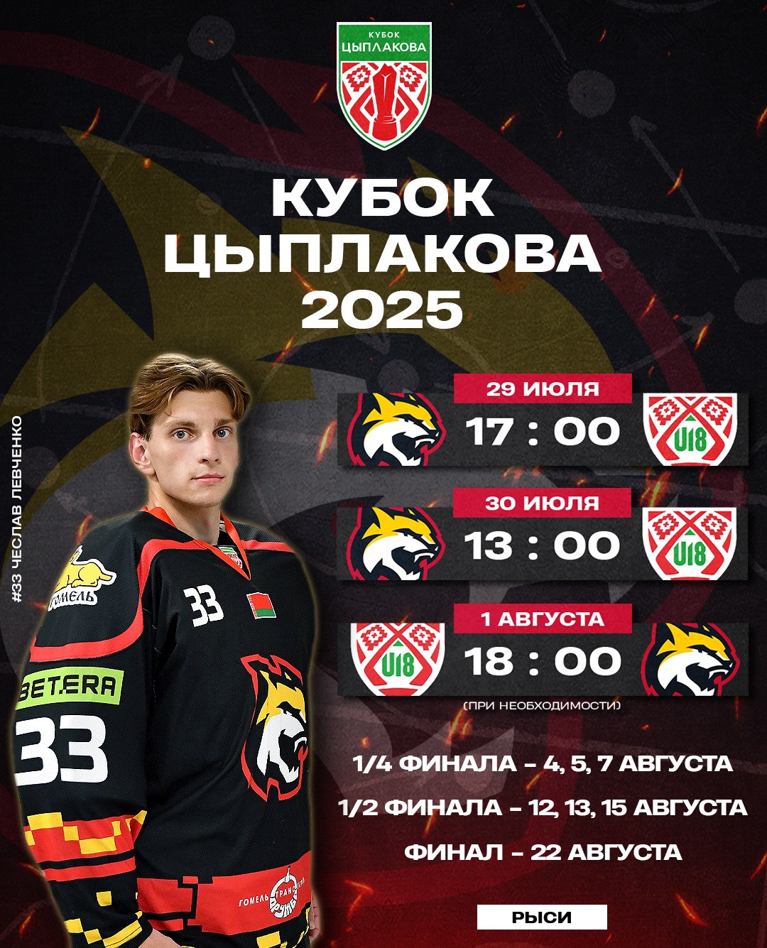«Рыси» определились с заявкой для участия в Кубке Цыплакова, который стартует 29 июля. В составе гомельчан – 29 хоккеистов, часть из них находится на просмотре. На стадии 1/8 финала их соперником станет сборная Беларуси U18. Матчи пройдут в Светлогорске 29, 30 июля и, при необходимости, в Минске 1 августа. Все серии плей-офф, за исключением финала, пройдут до двух побед. Финал будет состоять из одного поединка.