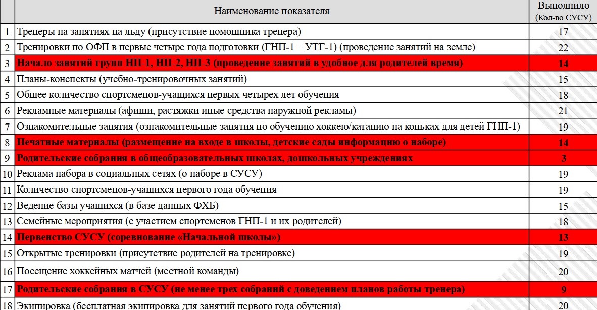 Касательно наименее выполняемых задач: обращает внимание, что зачастую это простейшие задачи, которые должны выполняться по умолчанию, так сказать «на автомате». С одной стороны, хорошо, что во многих случаях выполнены ключевые, базовые задачи деятельности школы, и резерв роста – в таких «мелочах». С другой стороны, такие «мелочи» могут вырасти в ком проблем, если на них долго не обращать внимания. Например, регулярно проводимые родительские собрания. Родители, законные представители – это, как ни крути, тоже участники процесса по подготовке хоккеистов, причем важные. И постоянная, структурированная связь с ними, когда тренер регулярно объясняет, что «сейчас мы здесь, а планируем прийти сюда, и для этого нам нужно вот это», позволяет не только избежать недопониманий, но и создать действительно мощный коллектив, работающий в одном направлении.