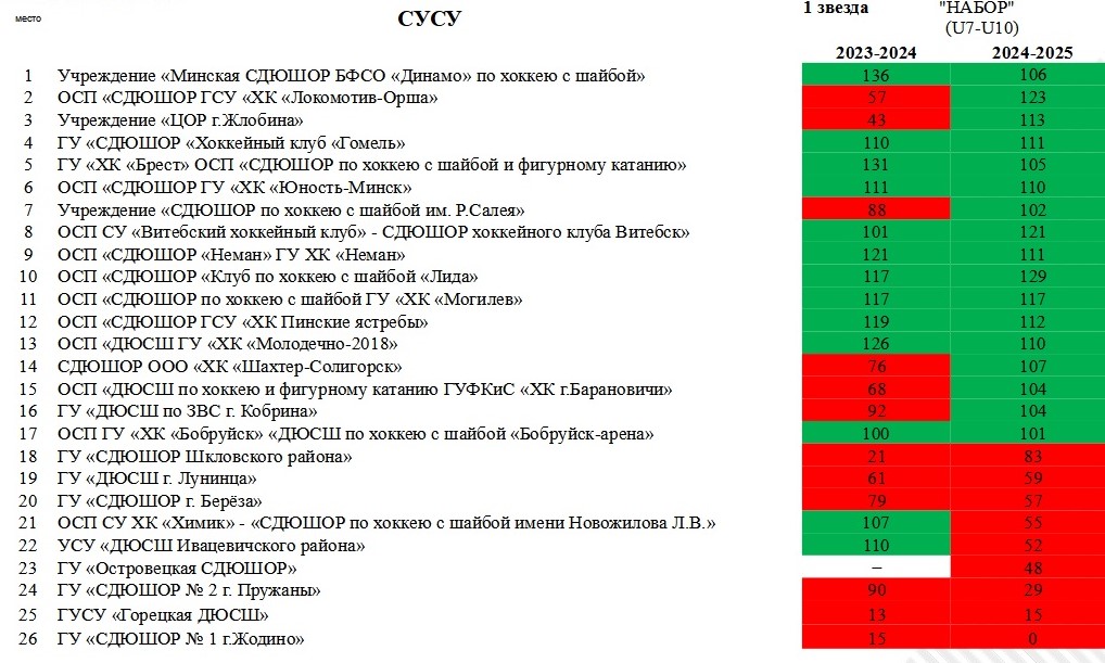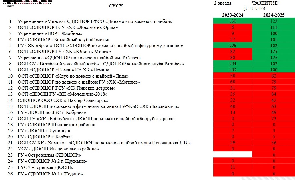 Вторую звезду («Развитие», 22 задания для возрастных категорий U11 – U16 ) в сезоне-2024/25 сумели получить 9 школ (год назад таких было всего 4). Еще 4 школы в этом году довольно близко подобрались к выполнению второй звезды – «Молодечно-2018», «Могилев», «Пинские ястребы» и «Бобруйск-Арена».