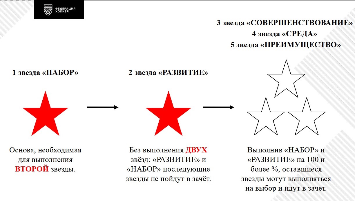 Отметим, что условия для получения первой звезды предполагают не только непосредственно набор детей (не только мальчиков, но и девочек) в группы начальной подготовки, но и другие действия, которые способствуют популяризации хоккея. В том числе предлагается предоставить детям на прокатной основе бесплатную экипировку – не обязательно полную, можно минимально необходимую защиту для начинающих заниматься (шлемы, налокотники, щитки, коньки). Приветствуется также проведение праздников для своих учащихся и их родителей, периодическое проведение открытых тренировок, за которыми могли бы наблюдать родители. Предлагается организовывать походы на хоккейные матчи взрослых команд, если такие проходят в городе.