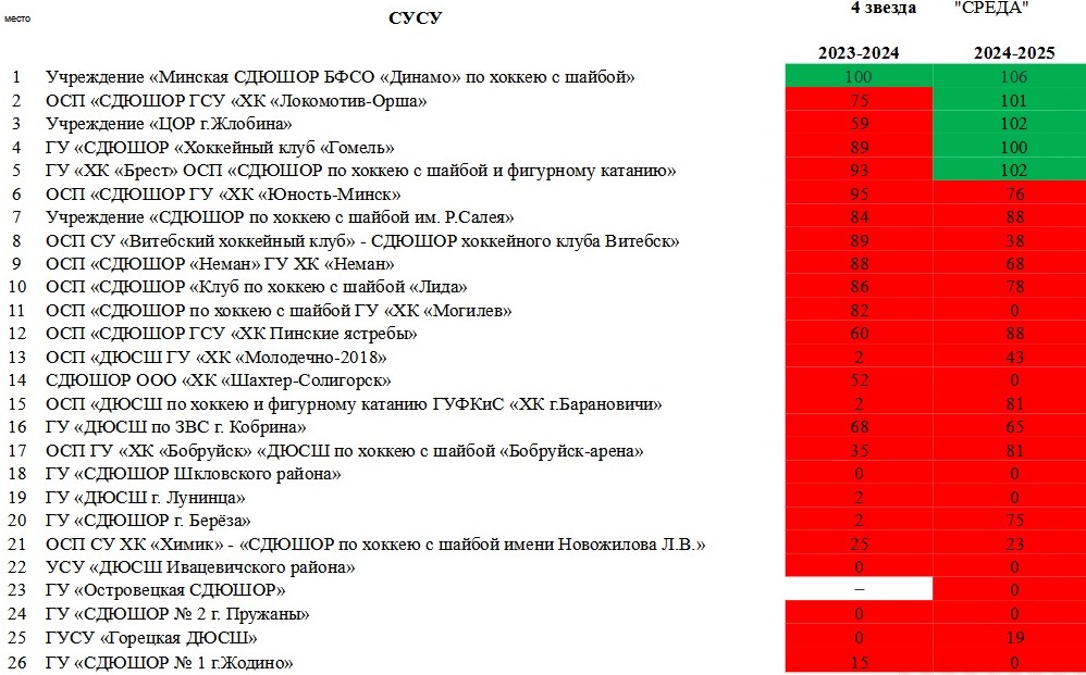 Условия для присвоения четвертой звезды («Среда», 19 заданий) выполнили 5 школ: «Динамо-Джуниверс», «Брест», ЦОР Жлобина, «Локомотив», «Гомель». Из остальных ближе всех к получению четвертой звезды подошли СДЮШОР им. Салея и «Пинские ястребы». Здесь мы видим значительный прогресс, ведь год назад четвертая звезда покорилась только «Динамо-Джуниверс».