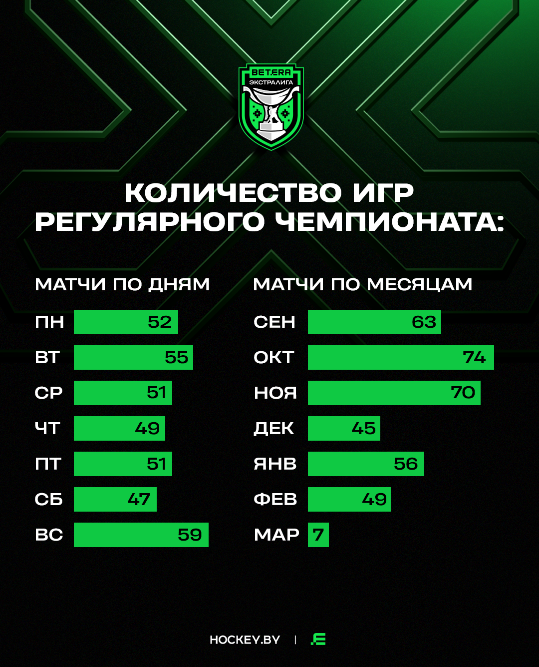 По месяцам матчи распределены следующим образом: сентябрь – 63, октябрь – 74, ноябрь – 70, декабрь – 45, январь – 56, февраль – 49, март – 7.