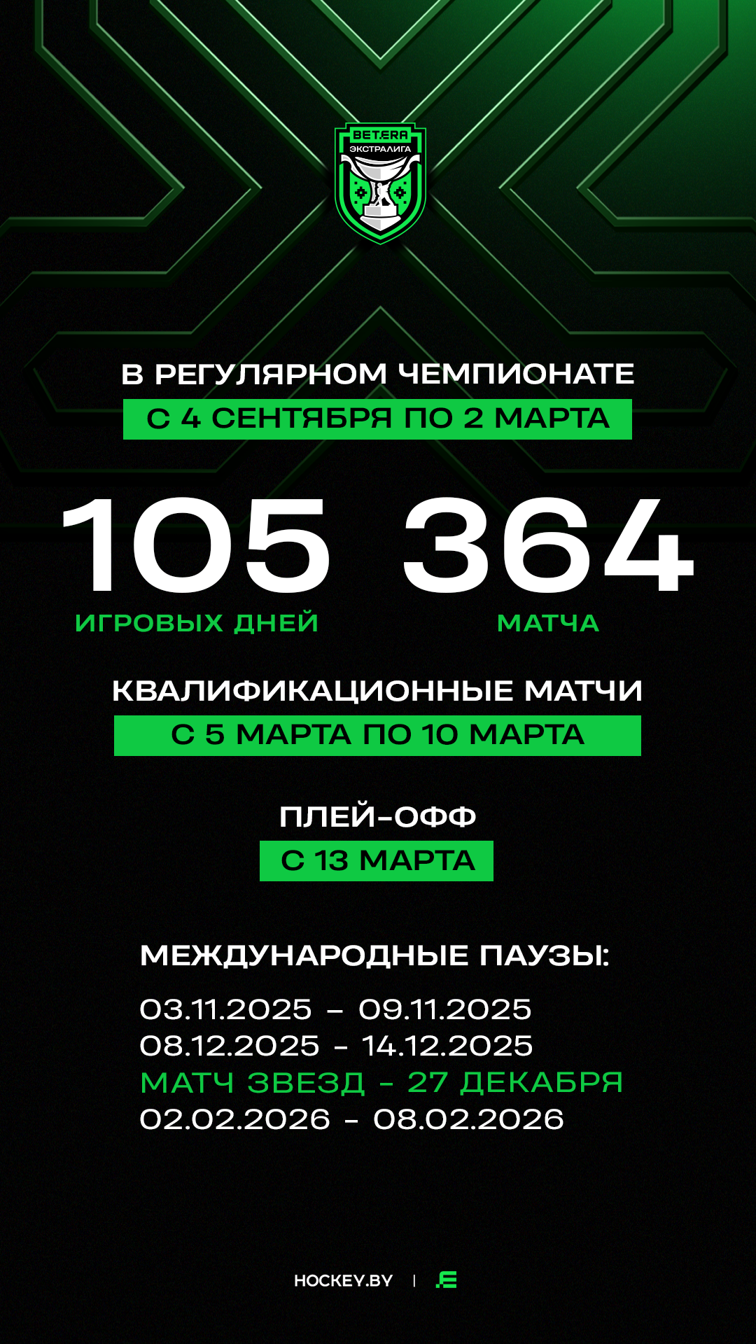 Hockey.by представляет календарь регулярного чемпионата сезона-2025/26 Betera-Экстралиги. Каждая команда проведет по 52 матча, всего же будет сыграно 364 матча, общее число игровых дней составит 105.