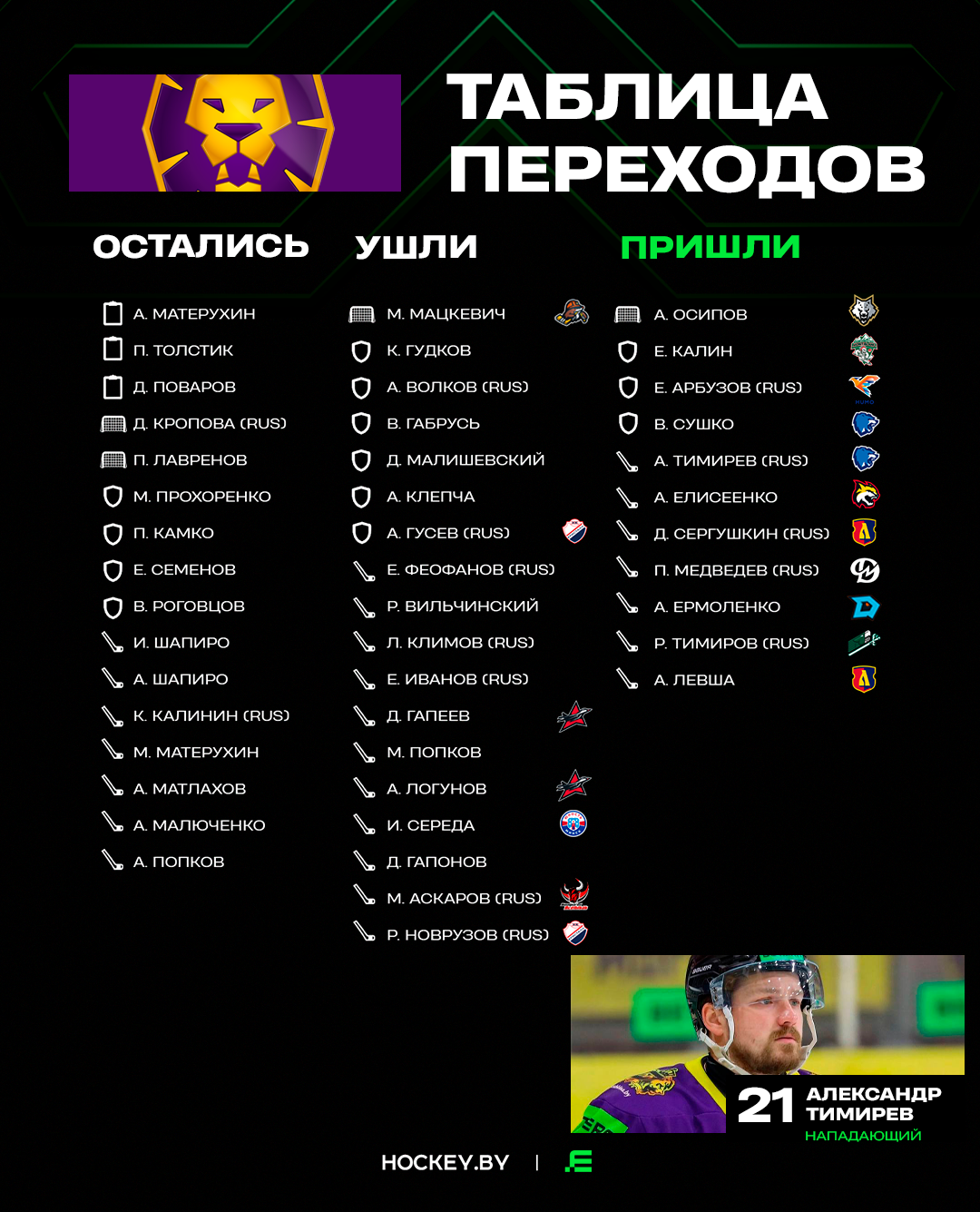 Одним из самых громких переходов межсезонья внутри экстралиги стало подписание лучшего снайпера «Витебска» в прошедшей регулярке Александра Тимирева, который весной стал вместе с «медведями» серебряным призером чемпионата Беларуси. В 2022 году этот российский форвард завоевывал Кубок Президента вместе с жлобинским «Металлургом», став тогда еще и лучшим снайпером всего гладкого чемпионата.