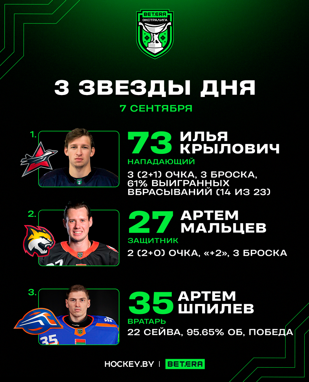 Сегодня, 7 сентября, в Betera-Экстралиге прошли три матча. Редакция Hockey.by выбрала лучших игроков дня.