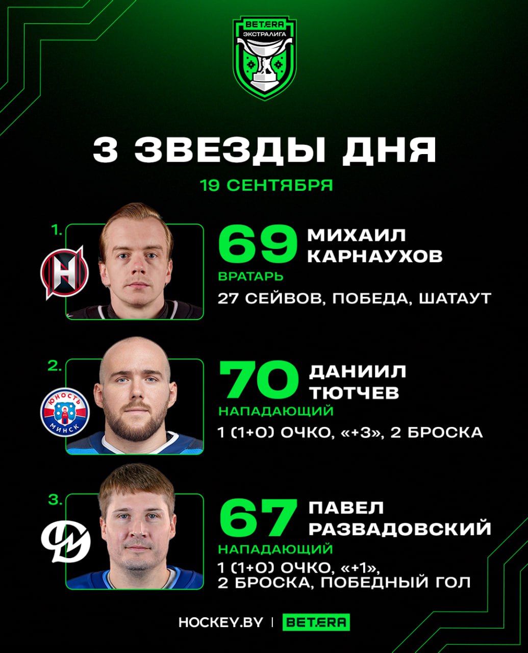 19 сентября в регулярном чемпионате Betera-Экстралиги состоялись три матча. Редакция Hockey.by определила трех звезд пятницы.