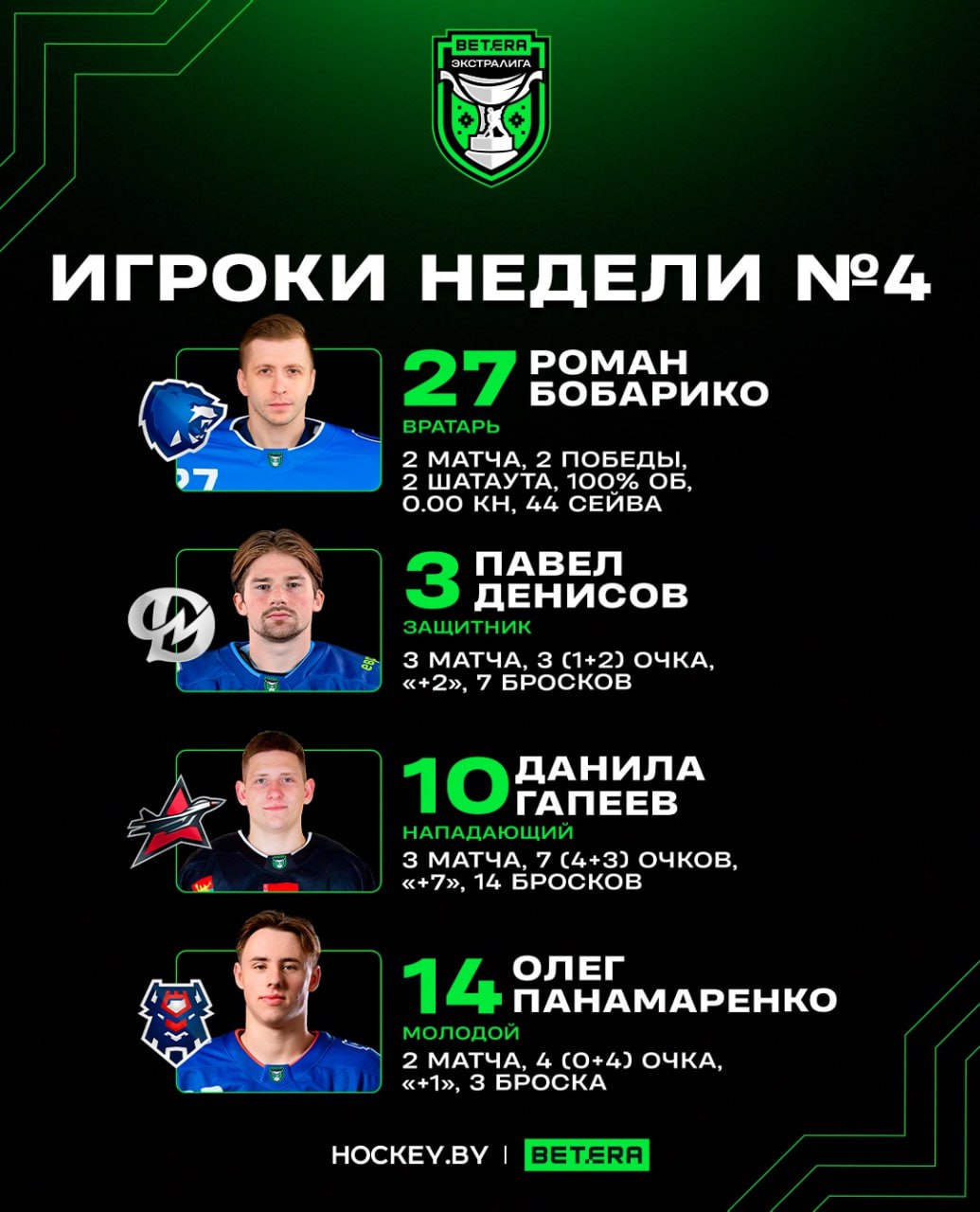 Роман Бобарико, Павел Денисов, Данила Гапеев и Олег Панамаренко – лучшие игроки четвертой недели Betera-Экстралиги