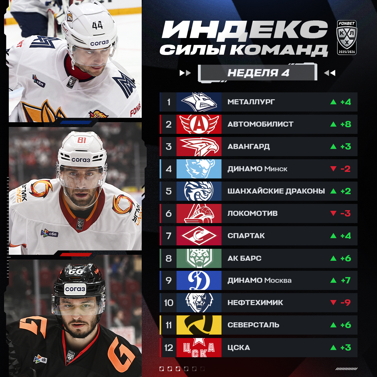Пресс-служба КХЛ представила обновленный индекс силы. После четвертой игровой недели минское «Динамо» занимает четвертую строчку в рейтинге «горячих» команд.