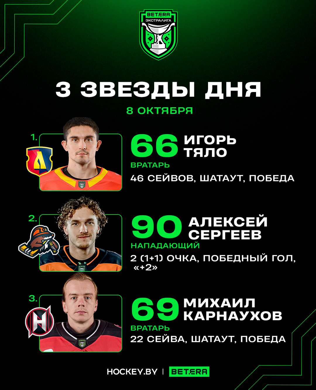 В среду в Betera-Экстралиге прошли три поединка. Редакция Hockey.by определила главных героев вечера.