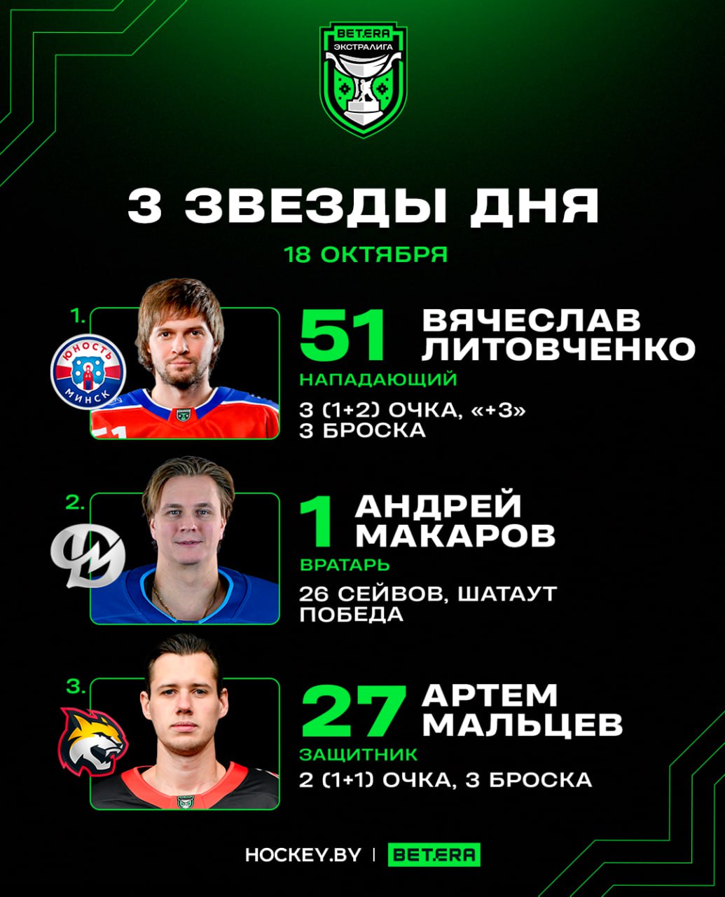 Первой звездой субботы стал капитан «Юности» Вячеслав Литовченко. Форвард набрал 3 (1+2) очка, забросил вторую шайбу в ворота «Шахтера», отдал две голевые передачи и привел минскую команду к победе над горняками (3:2). Литовченко трижды бросил в створ ворот и выиграл 14 из 20 (70%) вбрасываний при показателе полезности «+3».