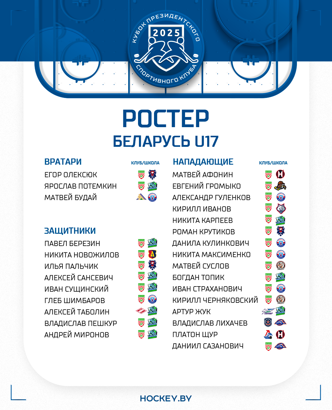 Стал известен состав юношеской сборной Беларуси на Кубок Президентского спортивного клуба, который пройдет в Минске с 5 по 8 ноября на льду столичной «Чижовка-Арены».