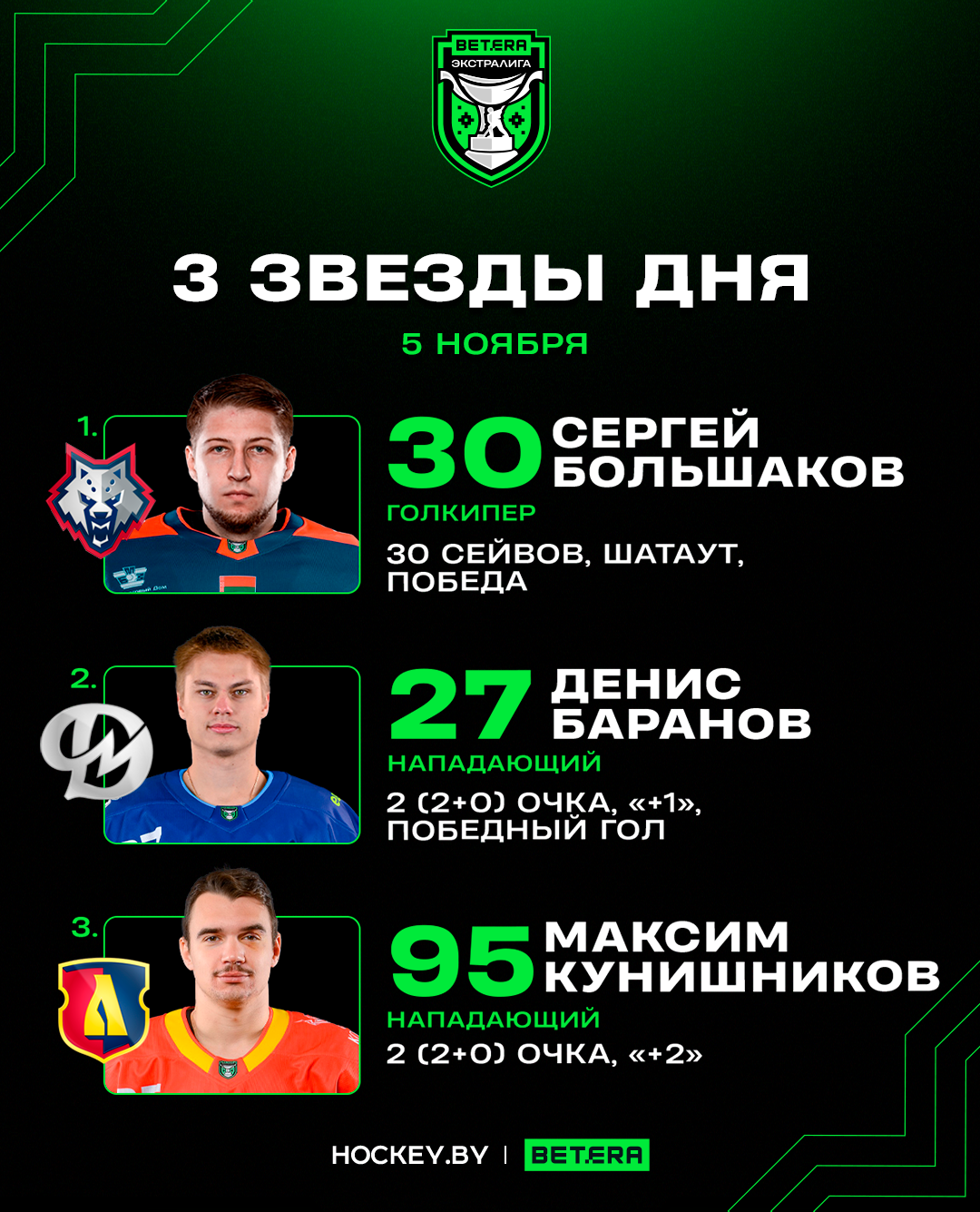 Сергей Большаков, Денис Баранов, Максим Кунишников – три звезды среды в Betera-Экстралиге
