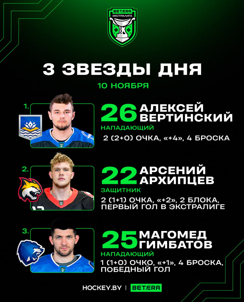 Алексей Вертинский, Арсений Архипцев, Магомед Гимбатов – три звезды понедельника в Betera-Экстралиге
