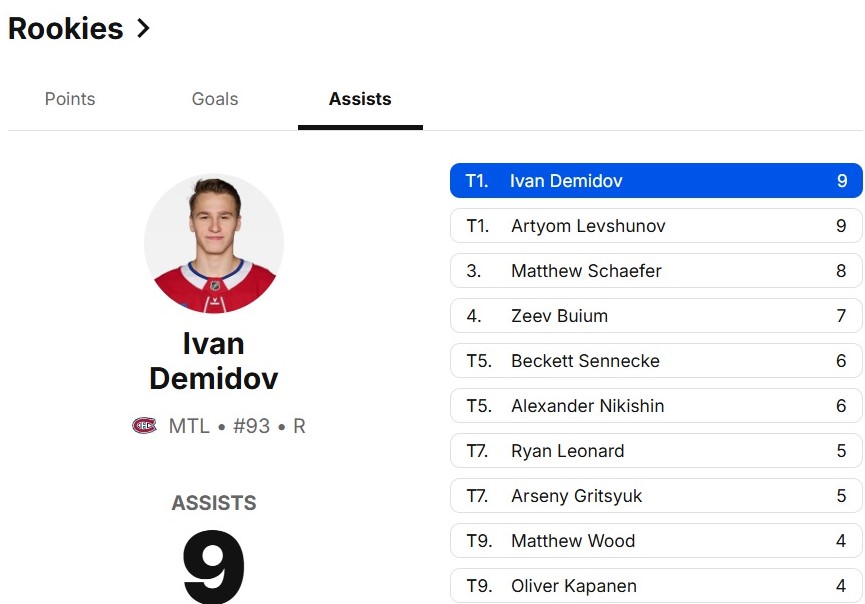 Белорусский защитник «Чикаго» Артем Левшунов (2005) делит лидерство с нападающим «Монреаля» Иваном Демидовым (2005) по числу ассистентских баллов (по 9) среди новичков нынешнего чемпионата НХЛ.