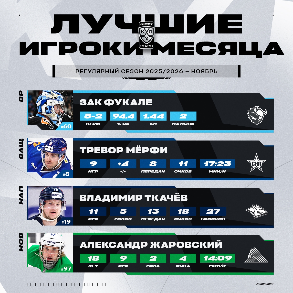Комиссия по определению лучших хоккеистов чемпионата КХЛ на основании статистических данных, предоставленных отделом статистики центрального информационного бюро КХЛ, и аналитической оценки матчей определила лауреатов ноября в четырех номинациях.