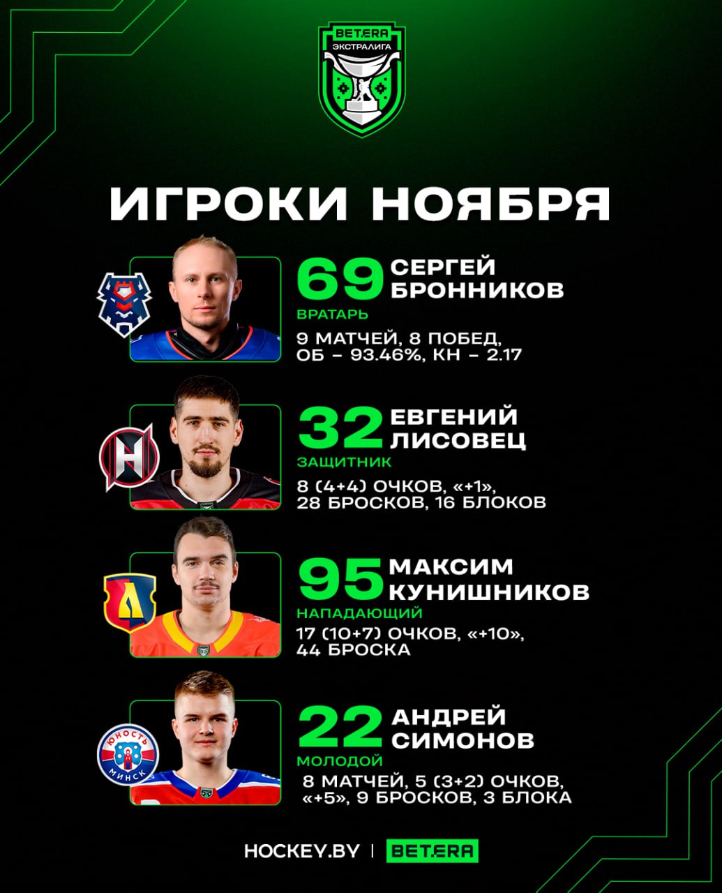 Сергей Бронников, Евгений Лисовец, Максим Кунишников и Андрей Симонов – игроки ноября в Betera-Экстралиге