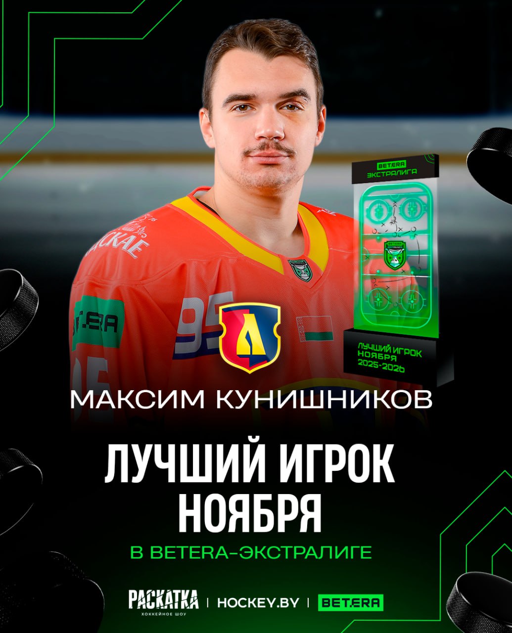 Нападающий «Лиды» Максим Кунишников признан лучшим игроком ноября в Betera-Экстралиге по итогам вашего голосования болельщиков в телеграм-канале «Betera-Экстралига | Extra.hockey».