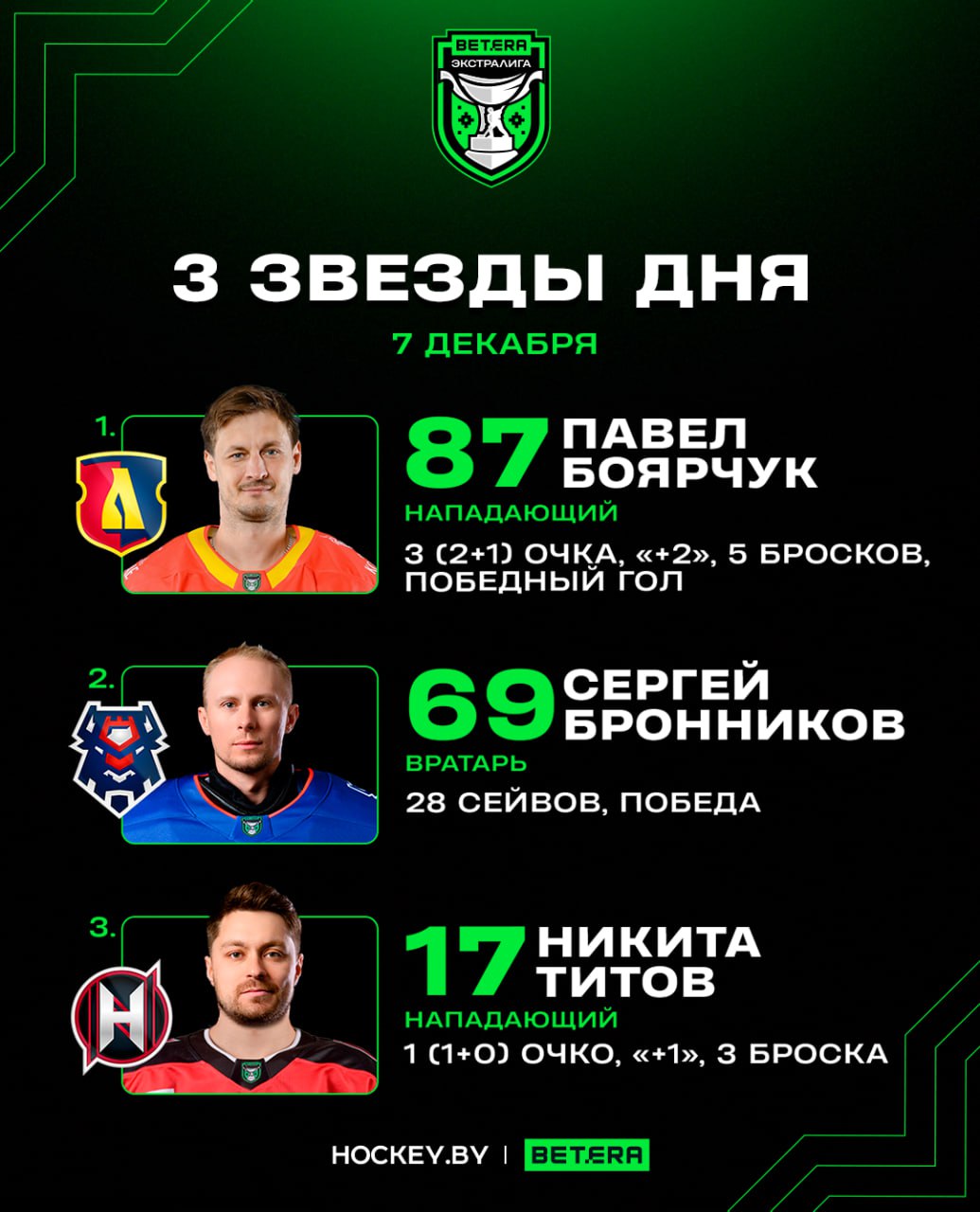 Сегодня, 7 декабря, прошли четыре матча регулярного чемпионата Betera-Экстралиги. Редакция Hockey.by выбрала лучших игроков дня.