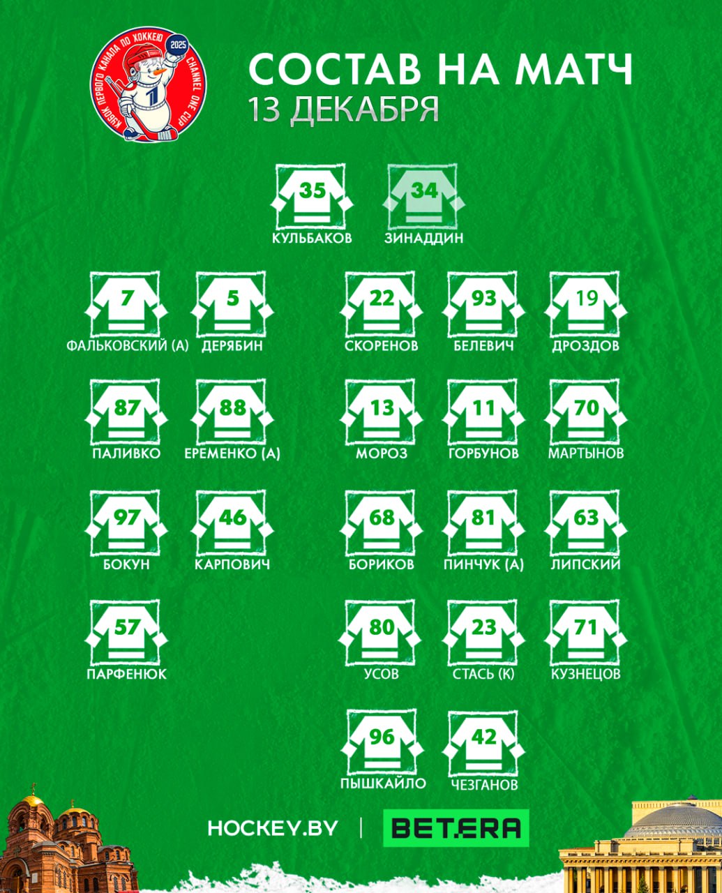 Сборная Беларуси сыграет с Россией в своем заключительном матче на Кубке Первого канала в Новосибирске. Стали известны составы команд. Первое и третье звенья остались такими же, как и в матче против Казахстана, во второй тройке Владимира Алистрова заменил Игорь Мартынов, в четвертой компанию Илье Усову составили Андрей Стась и Сергей Кузнецов, 13-м форвардом заявлен Егор Чезганов.