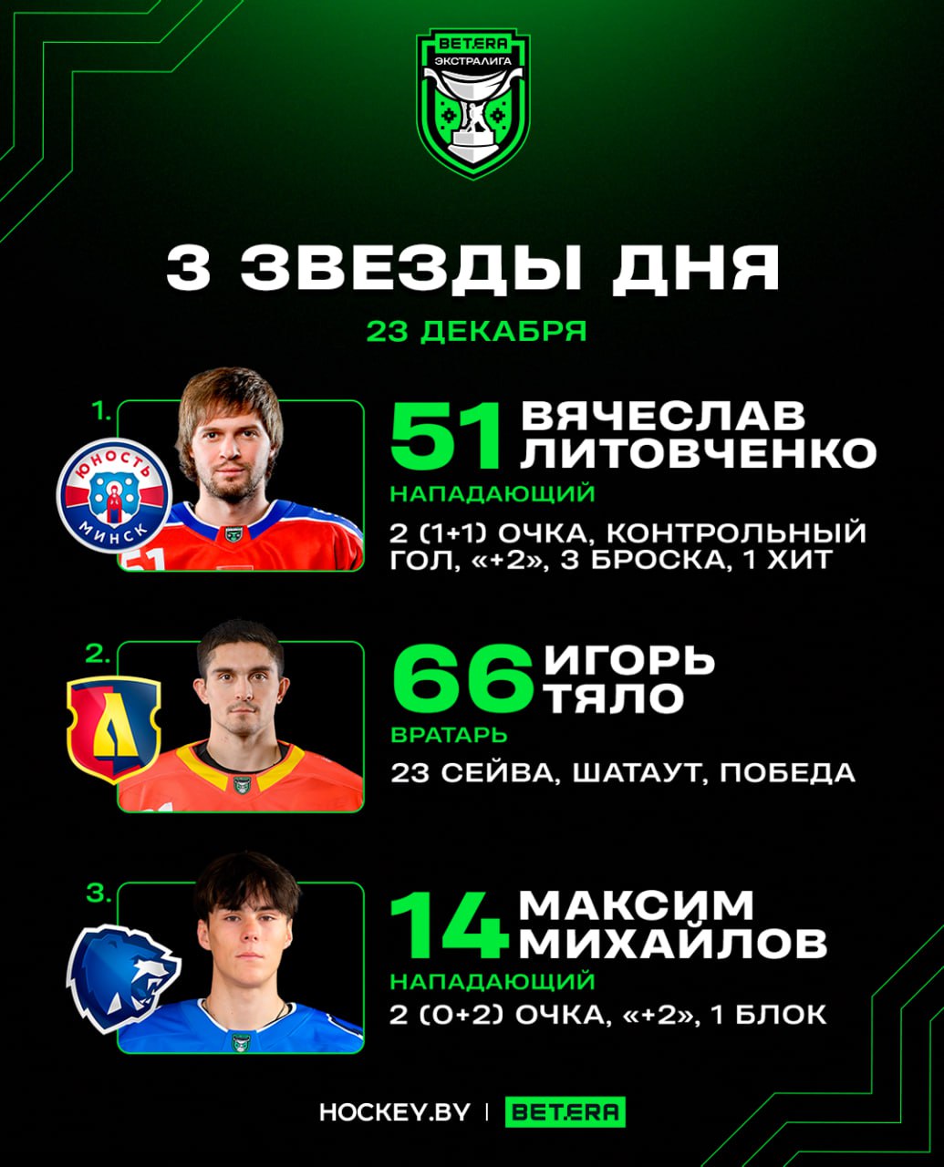 Вячеслав Литовченко, Игорь Тяло и Максим Михайлов – три звезды вторника в Betera-Экстралиги