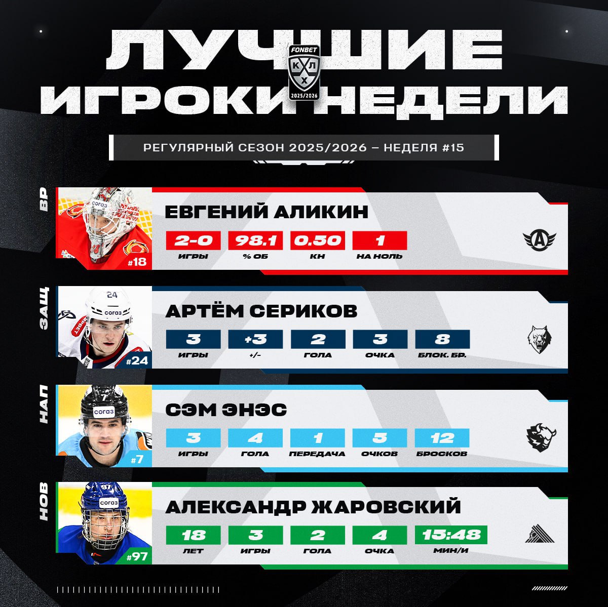 Комиссия по определению лучших хоккеистов на основании статистических данных, предоставленных отделом статистики Центрального информационного бюро КХЛ, и аналитической оценки определила лауреатов пятнадцатой недели чемпионата КХЛ сезона 2025/2026 в четырех номинациях.
