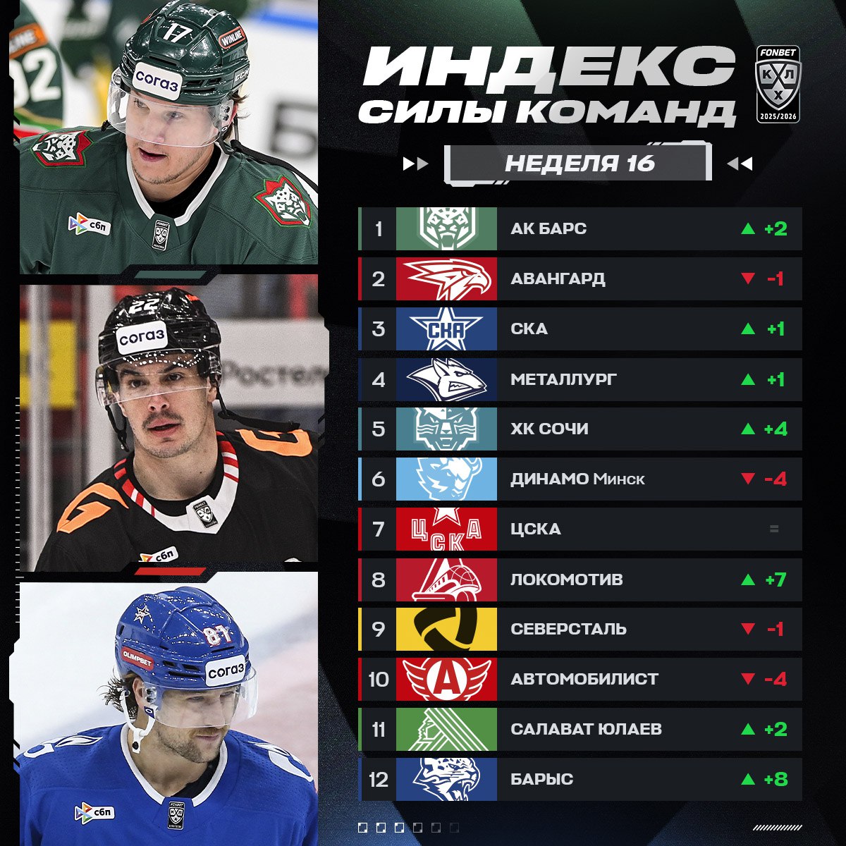 Континентальная хоккейная лига опубликовала рейтинг команд по индексу силы на 16-й неделе регулярного чемпионата. Минское «Динамо» опустилось на четыре позиции и заняло шестое место. «Зубры» – одна из самых горячих команд лиги, уже 10-ю неделю подряд они попадают в подборку.