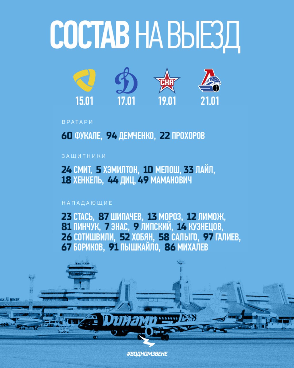 25 игроков минского «Динамо» отправились на выезд по маршруту Череповец – Москва – Санкт-Петербург – Ярославль, где «зубрам» предстоит провести четыре поединка.