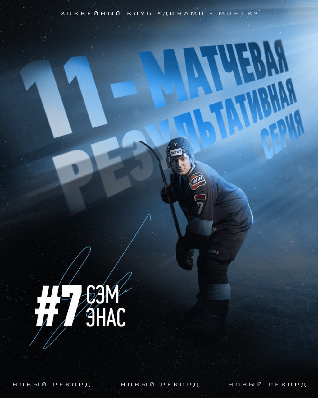 Форвард минского «Динамо» Сэм Энас, на 9-й минуте выездного матча против СКА в Санкт-Петербурге отличился голевой передачей и продлил свою результативную серию до 11 матчей – на этот момент – 19 (5+14) очков. Таким образом, Сэм Энас обновил клубный рекорд по продолжительности результативной серии.