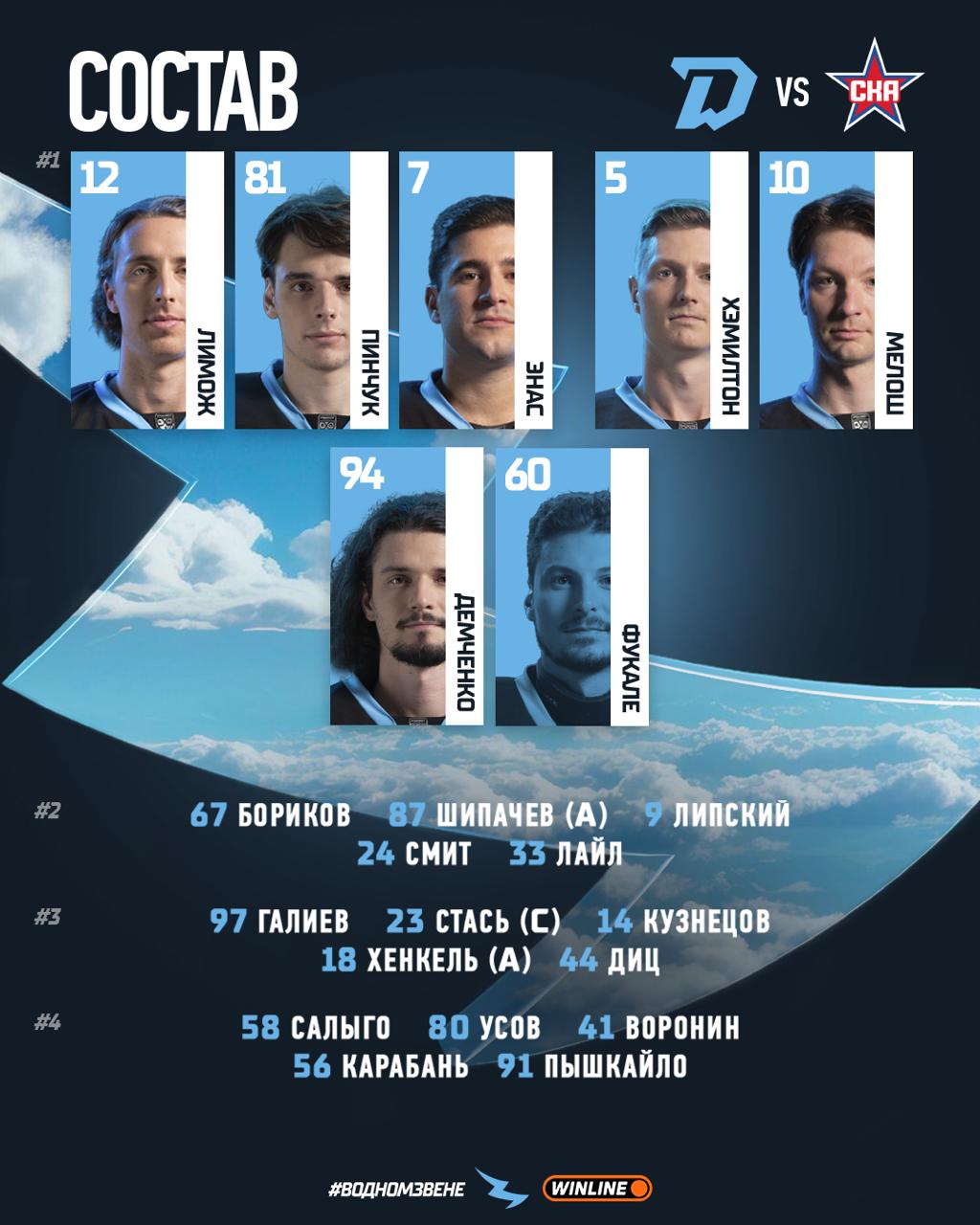 СКА: Иванов (Плешков); Филлипс – Сапего, Лайпсик – Короткий – Хайруллин (А); Савиков – Коледов, Дишковский – Недопекин – Поляков; Педан – Менелл, Уилсон – Бландизи – Гримальди; Зыков (А) – Плотников (К) – Голдобин; Зеленов.
