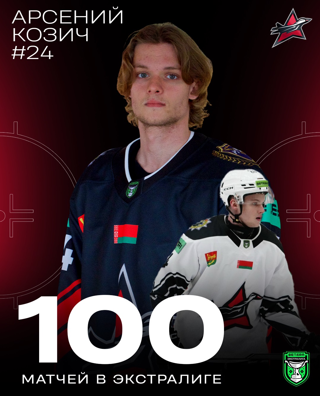 Победный матч с «Химиком» (3:1), состоявшийся 24 февраля в Барановичах, стал 100-м в Betera-Экстралиге для 21-летнего защитника «Авиатора» Арсения Козича (2004). Из них 96 поединков он провел в регулярных чемпионтах, где набрал 7 (2+5) очков при 24 минутах штрафа и показателе полезности «-1», еще 4 встречи на его счету в плей-офф – 0 (0+0), 4 минуты штрафа, «-1».