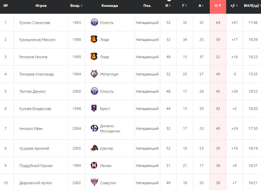 Нападающий «Юности» Станислав Кучкин стал лучшим бомбардиром регулярного чемпионата Betera-Экстралиги в сезоне-2025/26. На его счету 64 (32+32) очка в 52 матчах. Незадолго до финиша он обошел форварда «Лиды» Максима Кунишникова, у которого 59 (34+25) баллов в 52 встречах. Замкнул тройку лидеров еще один нападающий «Лиды Никита Ремезов – 52 (15+37) очко в 48 играх.
