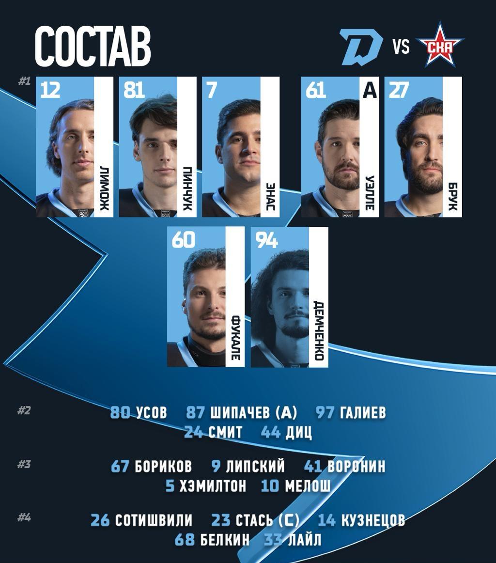 СКА: Иванов (Плешков); Филлипс – Сапего, Поляков – Короткий – Хайруллин (А); Педан – Выдренков; Гримальди – Недопекин – Бландизи; Савиков – Менелл, Уилсон – Плотников (К) – Голдобин; Лутфуллин – Воробьев (А) – Дишковский; Зеленов.