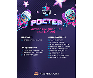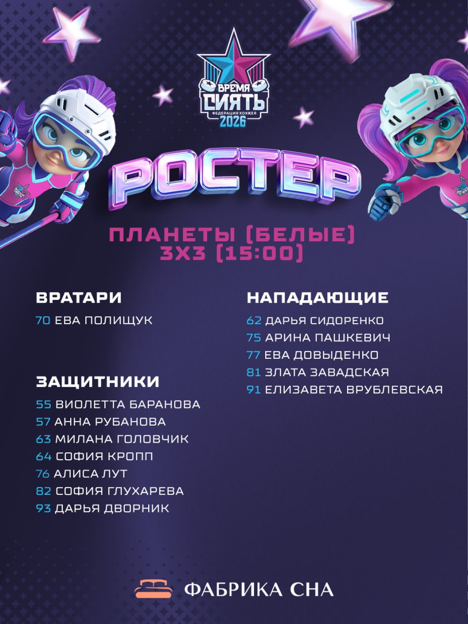 Завтра, 7 марта, на льду «Олимпик Арены» состоится главное событие в женском хоккее Беларуси – в пятый раз пройдет Всемирный женский хоккейный матч. В нынешнем году мероприятие соберет более 240 участниц со всей страны. Global Girls’ Game – это инициатива Международной федерации хоккея (ИИХФ), направленная на развитие этого вида спорта среди девушек. Матч проходит по всему миру в формате противостояния «Синих» и «Белых» и длится в течение нескольких дней, пока не будет сыгран в каждой стране-участнице. Фактически, на протяжении двух суток игры идут каждый час. Все заброшенные в матчах шайбы суммируются, в итоге победа достается команде, общий счет голов которой будет больше. В нашей стране будут соревноваться 9 «Синих» и 9 «Белых» команд. Ниже можно ознакомиться с ростерами «Белых» команд: «Кометы», «Ракеты», «Метеоры», «Вселенные», «Галактики», «Планеты», «Астероиды», «Искры» и «Звезды».