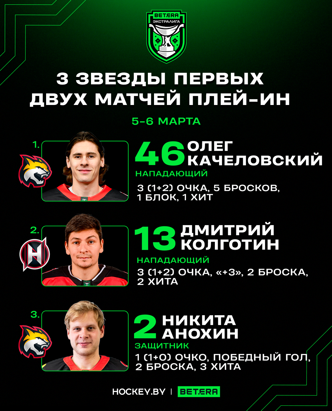 Олег Качеловский, Дмитрий Колготин и Никита Анохин – три звезды первых матчей раунда плей-ин Betera-Экстралиги